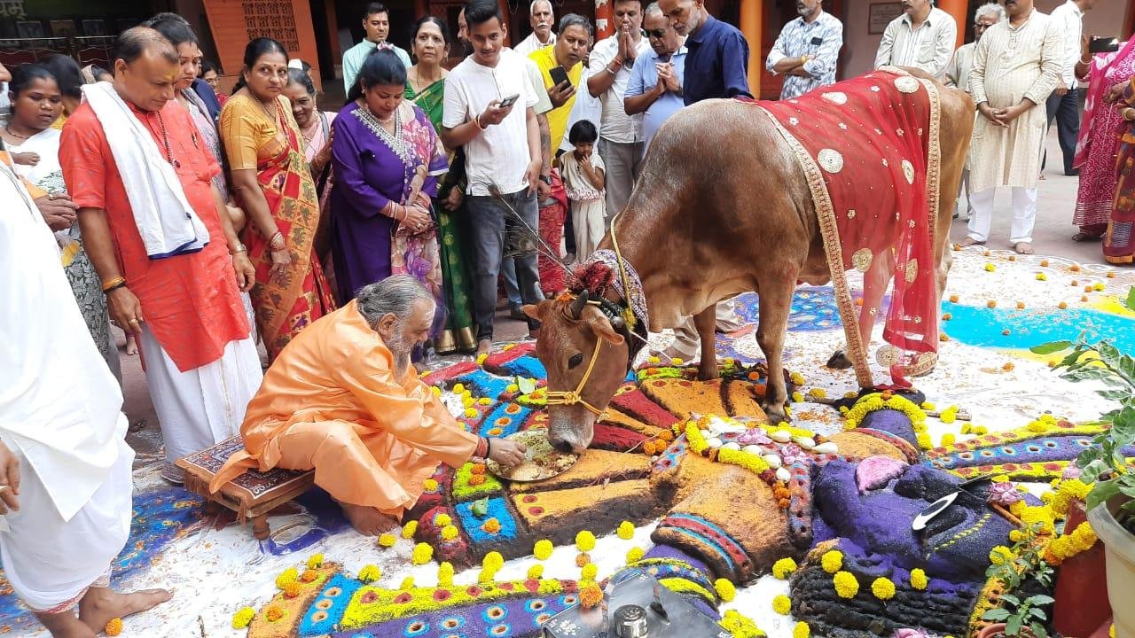 मंदिर के यज्ञशाला प्रांगण में गोबर से निर्मित 9 फुट के विशाल गोवर्धन भगवान के ऊपर गौशाला की गाय का विचरण कराया गया. प्रारंभ में स्वामी जी के साथ भक्तजनों ने गोवर्धन पर्वत एवं गौमाता की पूजा अर्चना कर संकीर्तन के साथ परिक्रमा की.